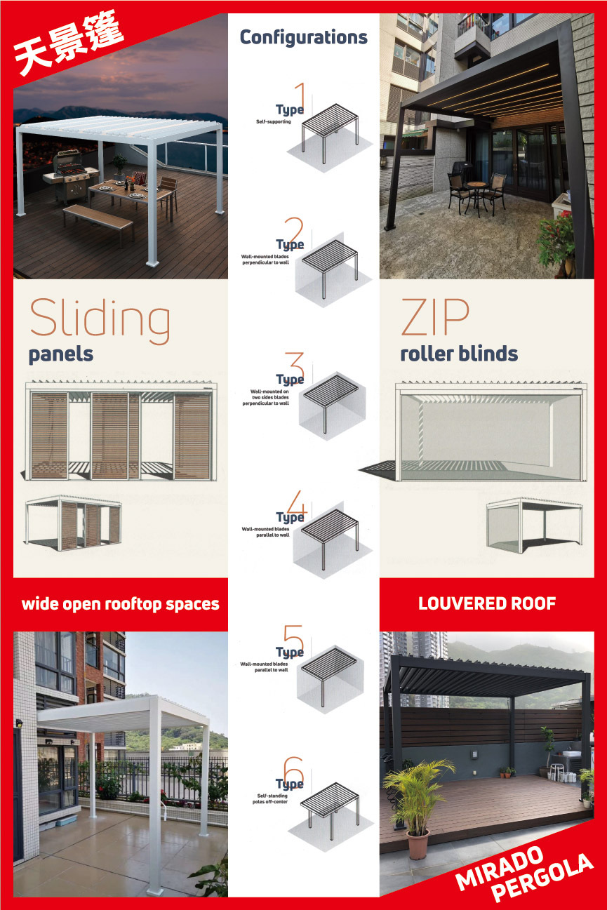 為您準備的星光百葉棚,有各種尺寸可供選擇。 屋頂百葉窗可以產生陰影,也可以打開讓陽光進入。