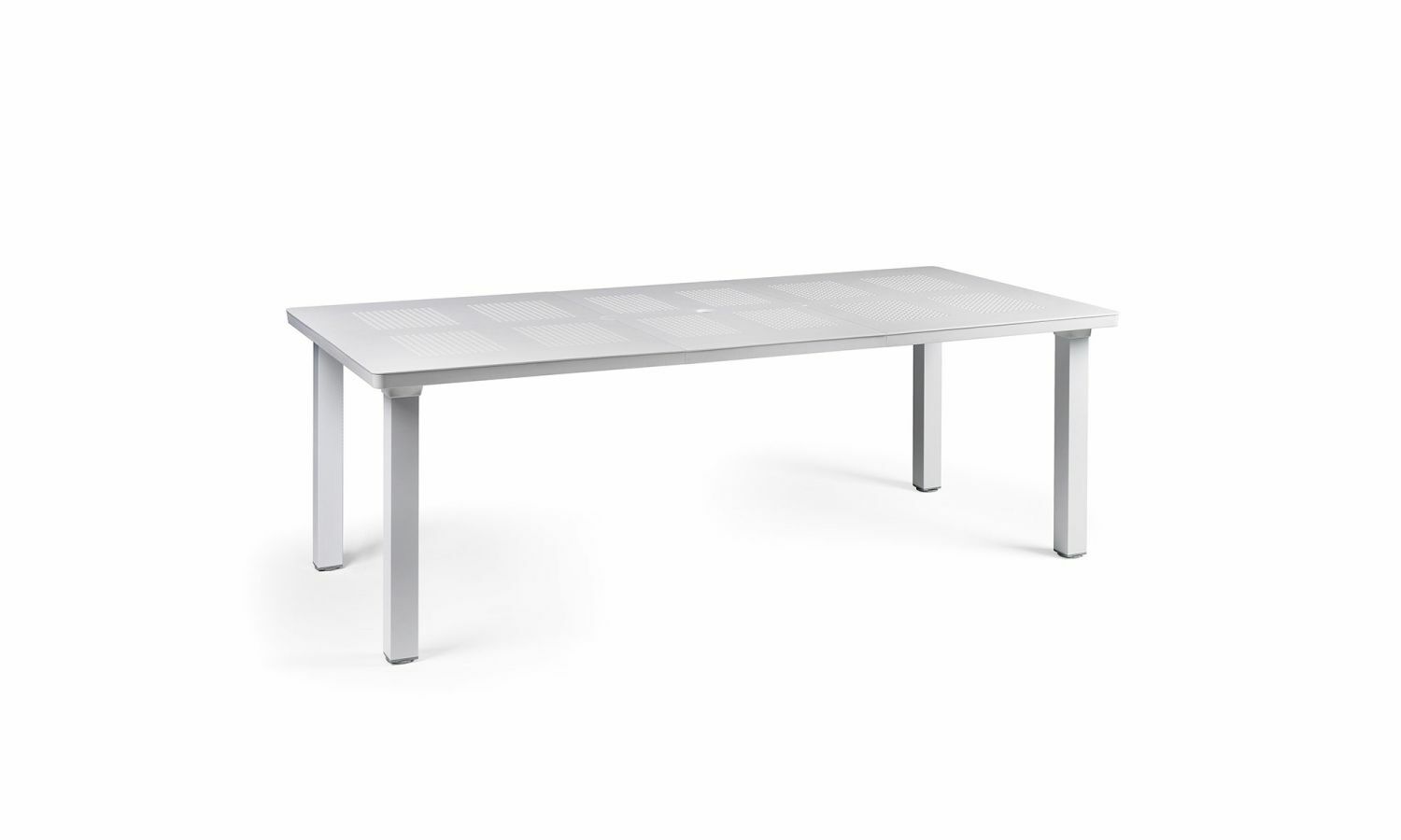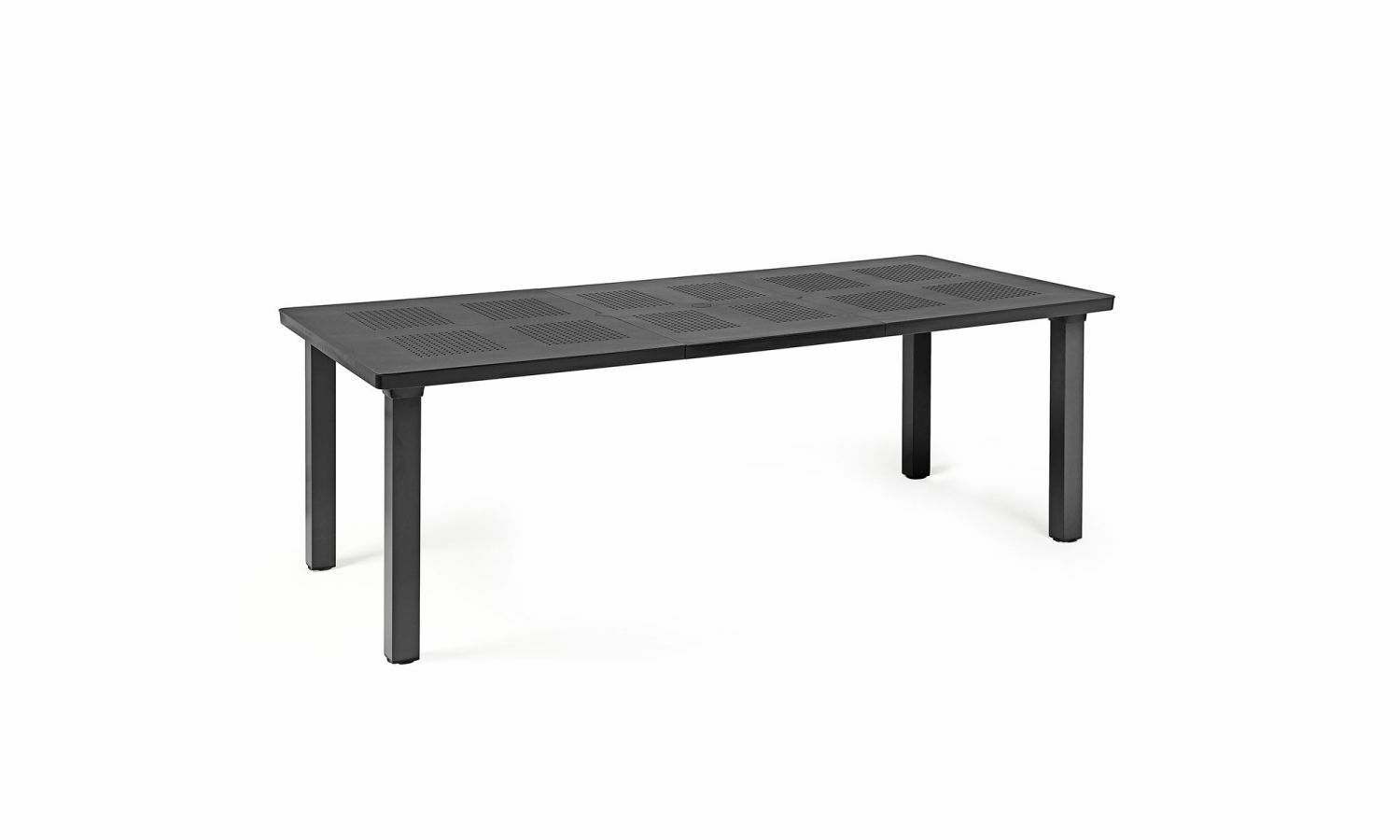 聚丙烯可伸縮戶外桌子; 該設計讓人聯想到傳統的鍛鐵家具。 頂部飾有重複的小穿孔圖案。 方形截面腿,用簡單的螺絲系統固定在頂部。