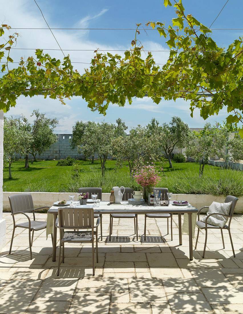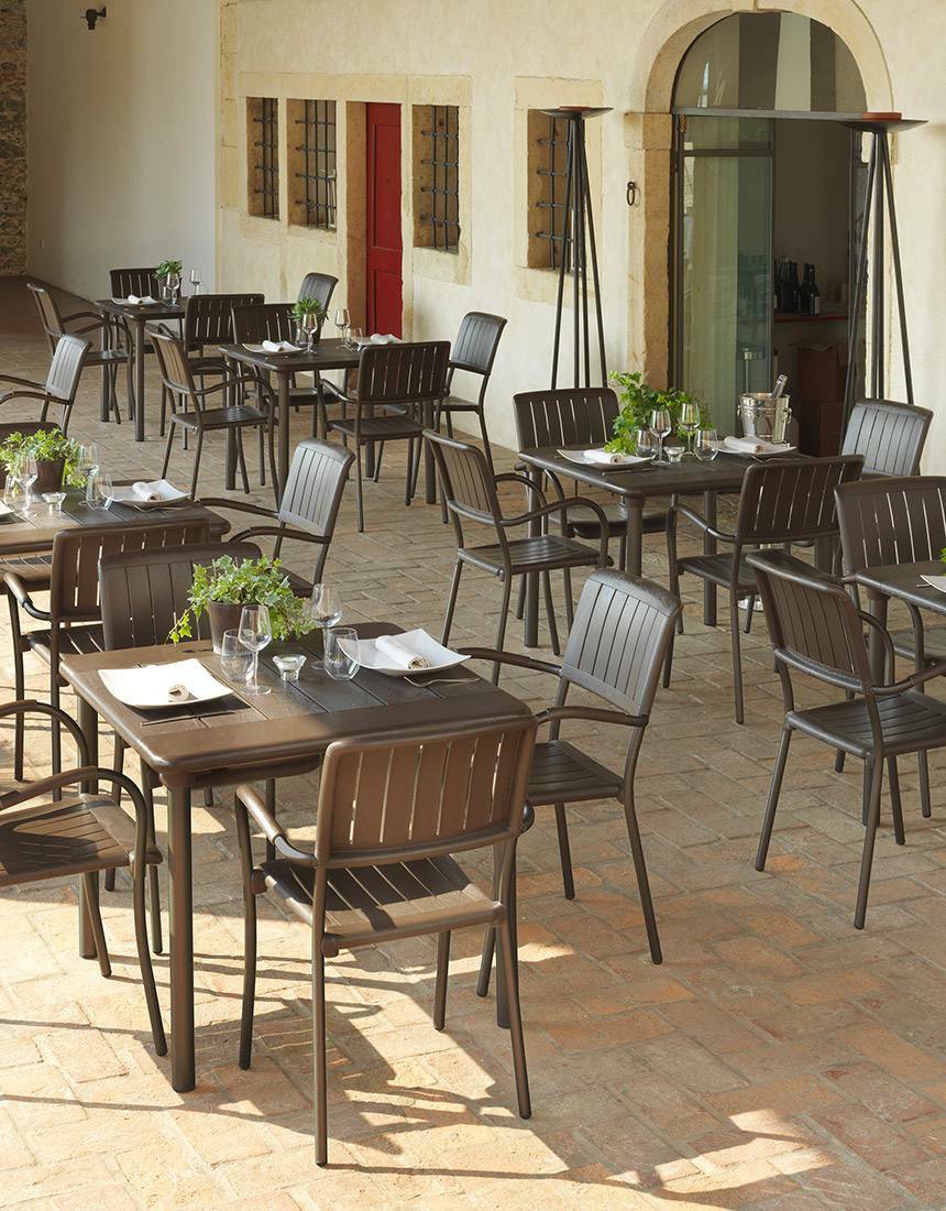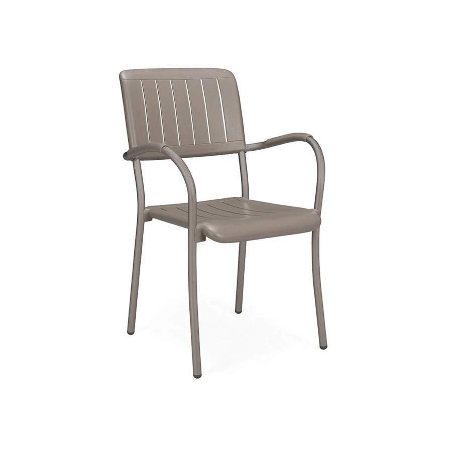 大而舒適的樹脂椅子,適合戶外使用,配有扶手和鋁製腿。 高衝擊設計的特點是座椅和靠背上的平行板條圖案。