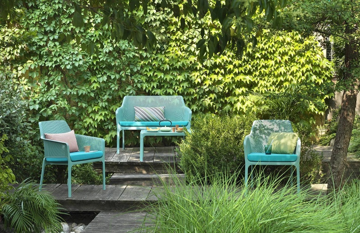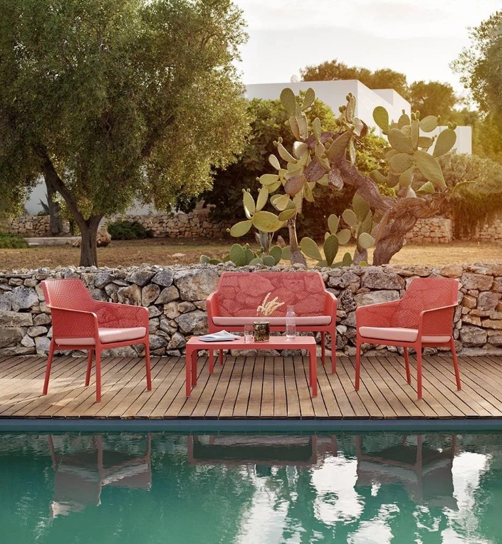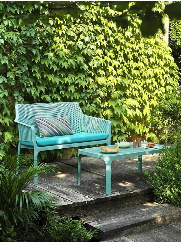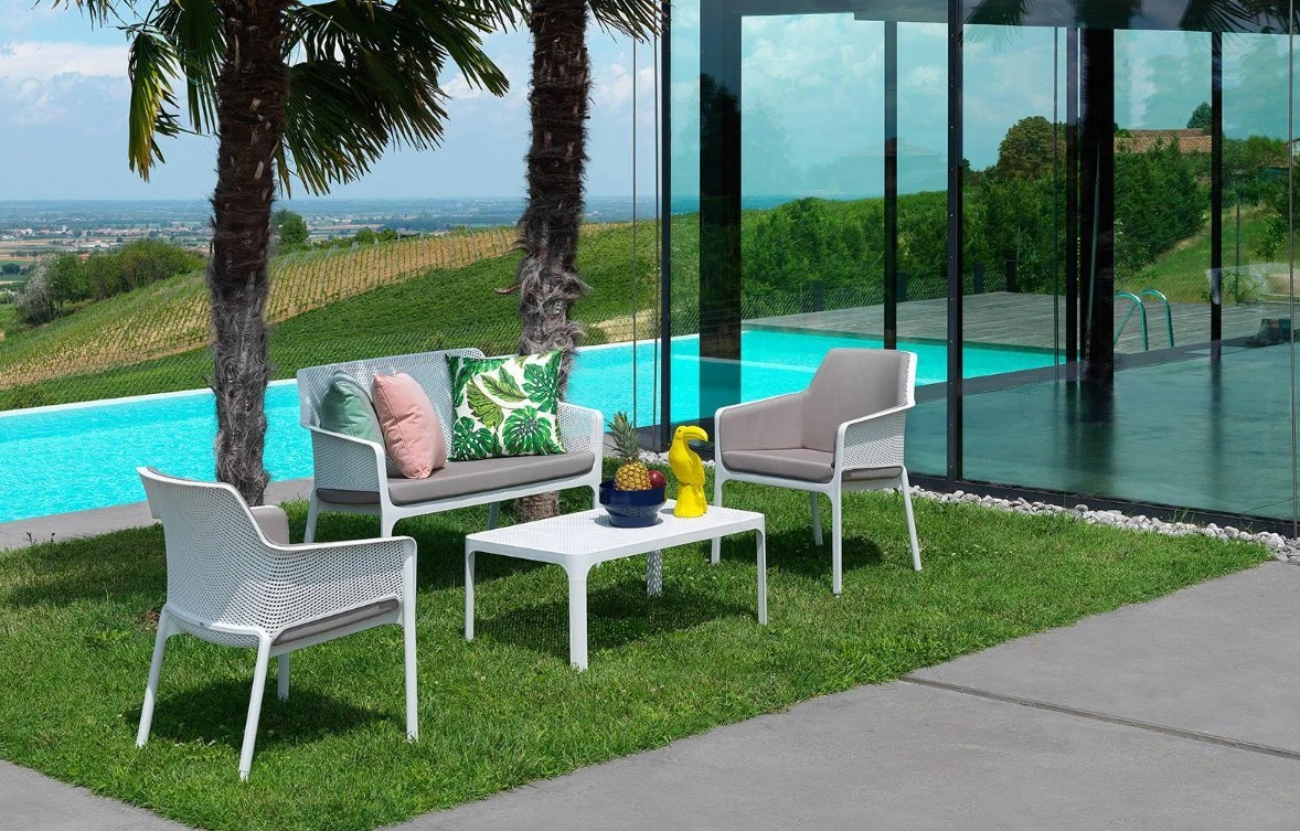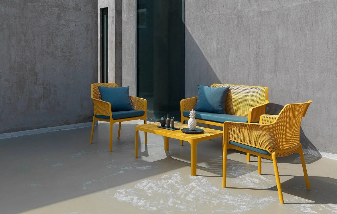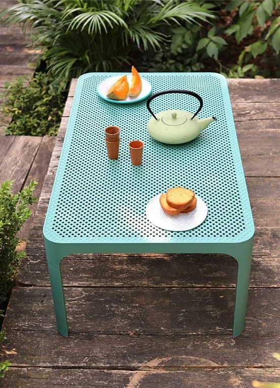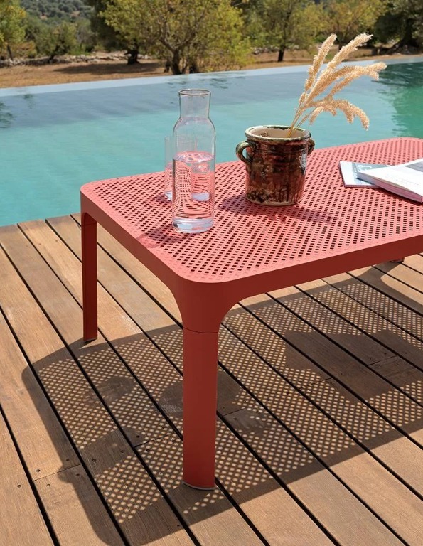 優雅的低矮茶几採用整體染色的玻璃纖維樹脂製成,配有矩形桌面,並飾以穿孔圖案——此設計元素貫穿整個Net系列。