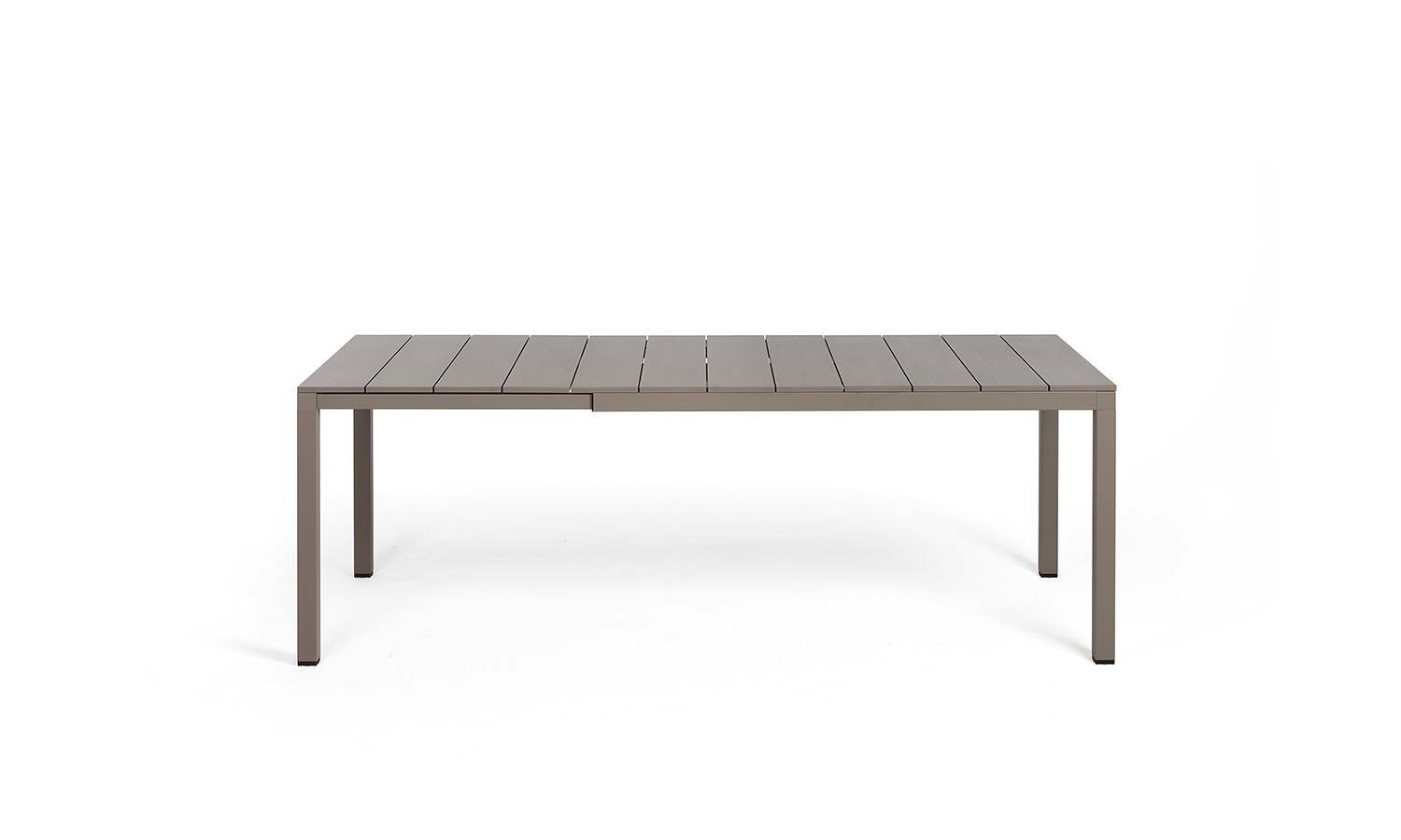 具有建築細節和強烈個性的可伸縮桌子。 塗層鋁板條頂部,飾有小條紋圖案。 塗層鋁框架。 有兩種尺寸可供選擇,以滿足不同的空間要求。