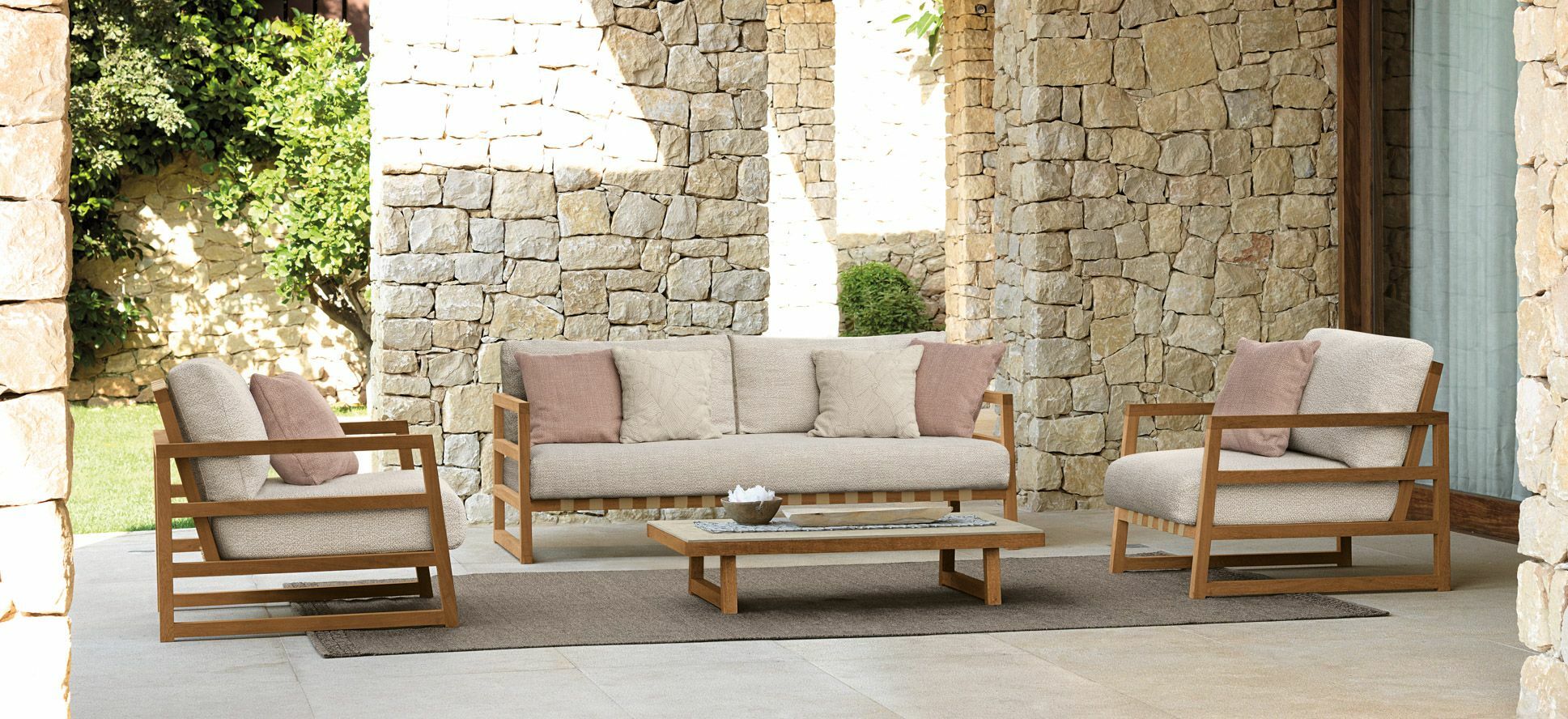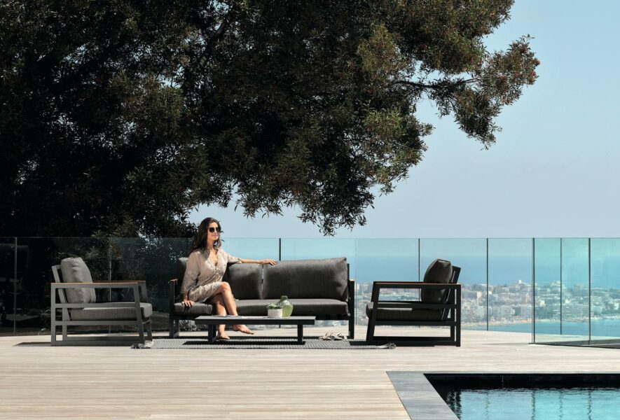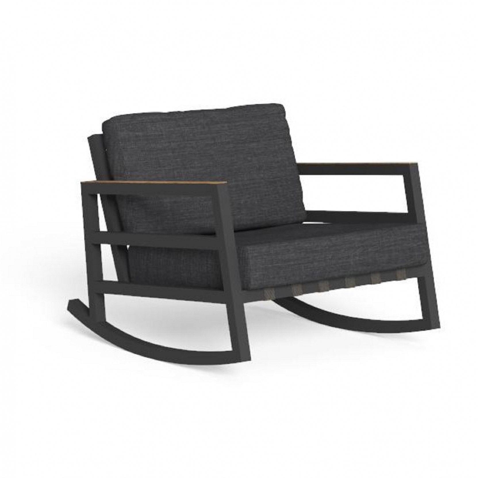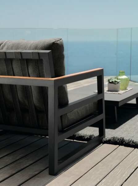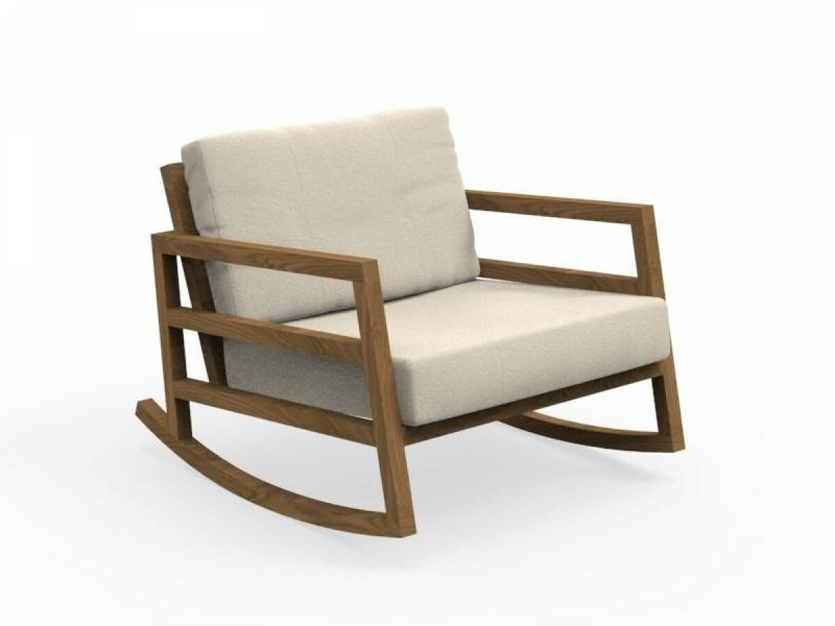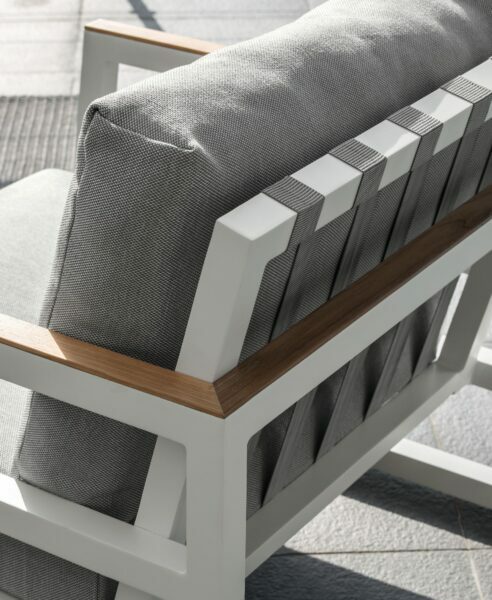 It’s easy to get lost in pleasant moments of relaxation while rocking by the Alabama Alu rocking chair. The result of a complex and meticulous work entirely handmade, the rocking chair stands out for its sophisticated Italian design and the nobility of the artisan tradition. The structure is in powder-coated aluminium and a teak slat finishes the upper side of the armrests and of the backrest. Synthetic elastic straps specific for outdoor spaces support the seat and the backrest. The cushions are in removable fabric, easy to wash and weather resistant. The padding is in quick dry foam.