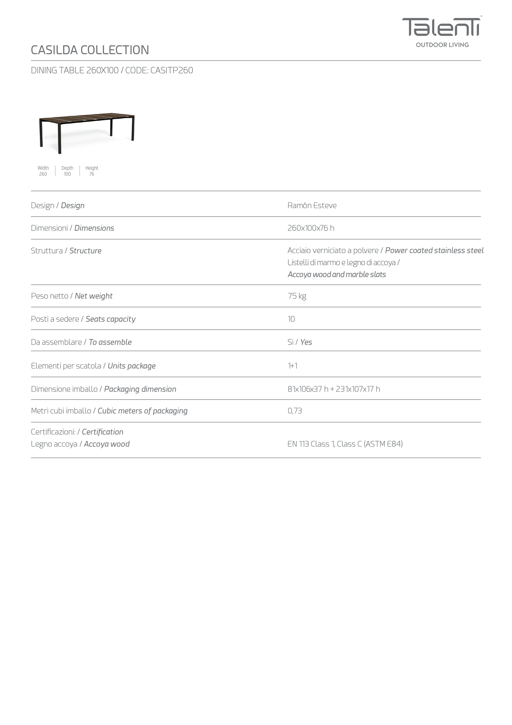 The casilda dining table 260×100 with a stainless steal frame powder coated and iroko wood top is combined with marble slat according to the colour base.