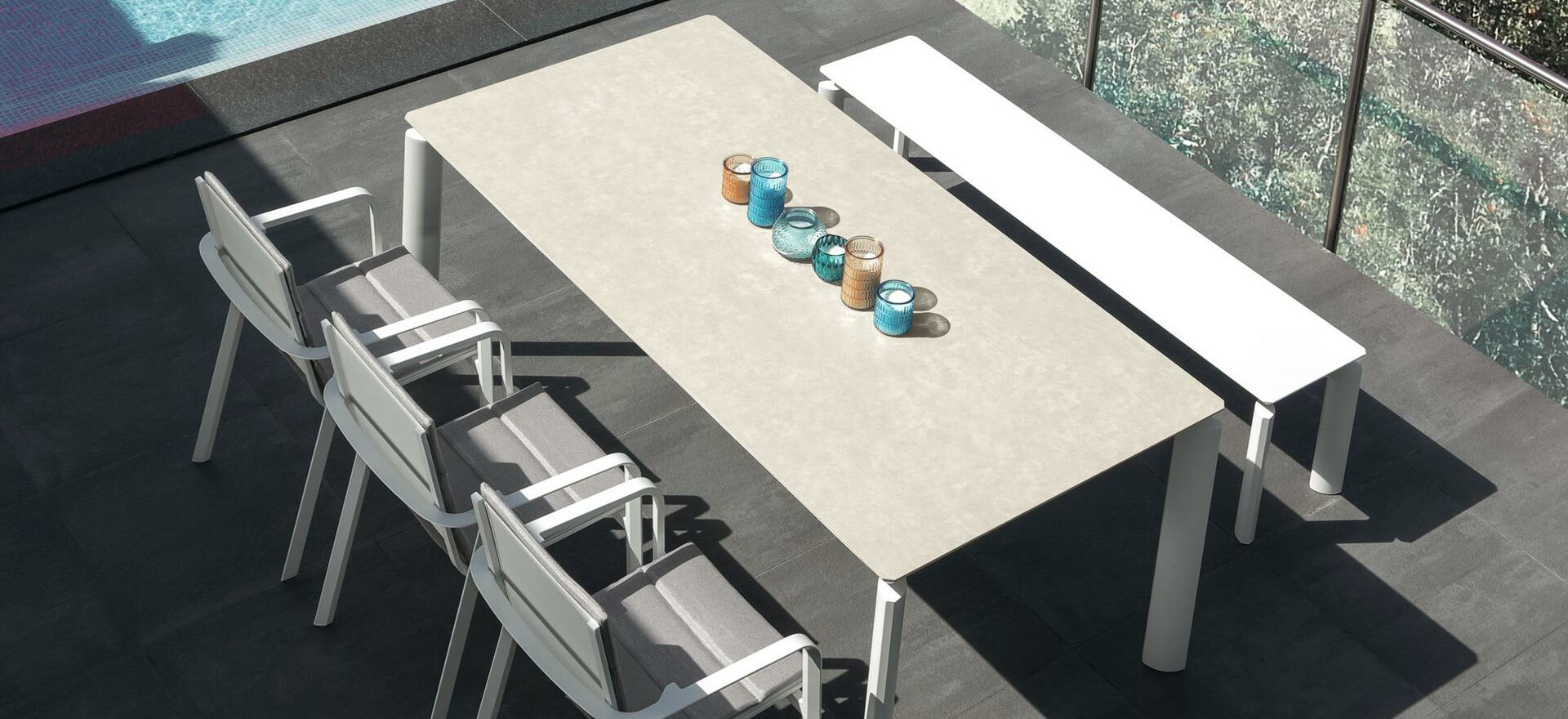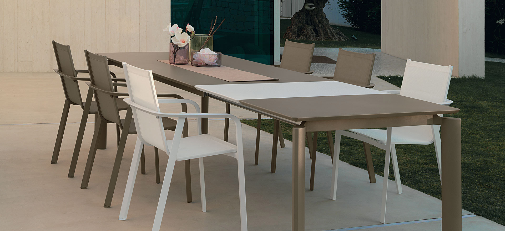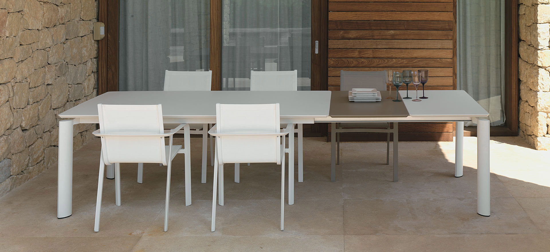 Aluminium structure and ceramic top for this elegant table by Milo. The table can extend up to 260 cm with an extension in aluminium included in the structure and up to 320 cm with an extra ceramic panel. It combines perfectly with the Milo dining chairs to create a romantic, modern but timeless decor.