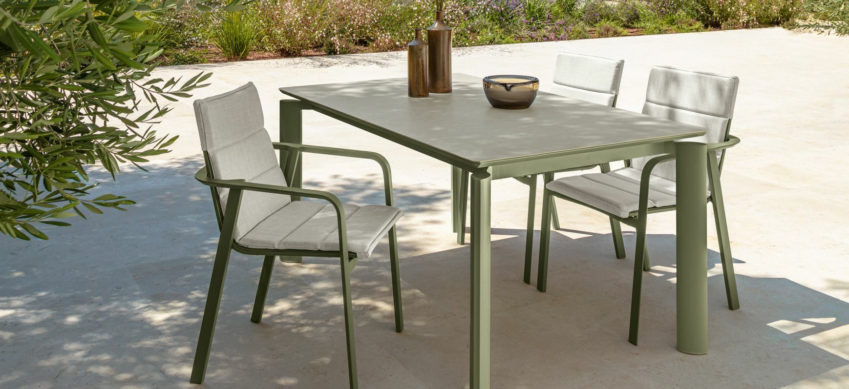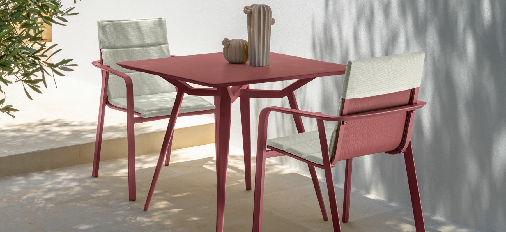Romantic elegance and attention to detail are the distinctive elements of the Milo outdoor chair. Powder coated aluminium structure and textilene seat, a synthetic material able to resist to compressive stresses, tears, atmospheric agents and UV rays. The chair is stackable. Available optional cushion in light or dark grey.